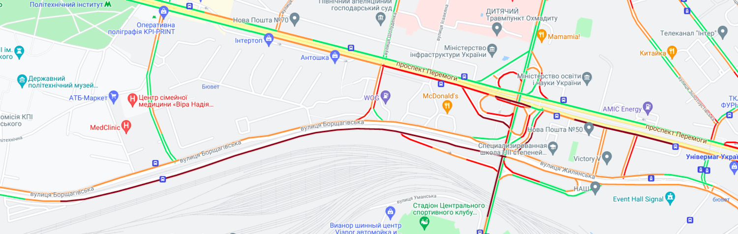 "Апостроф" публікує карту заторів у районі Повітрофлотського мосту.
