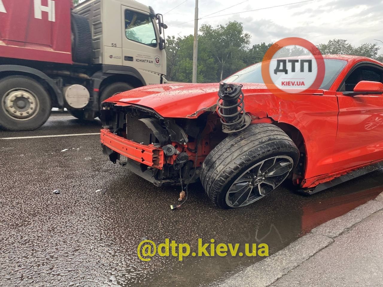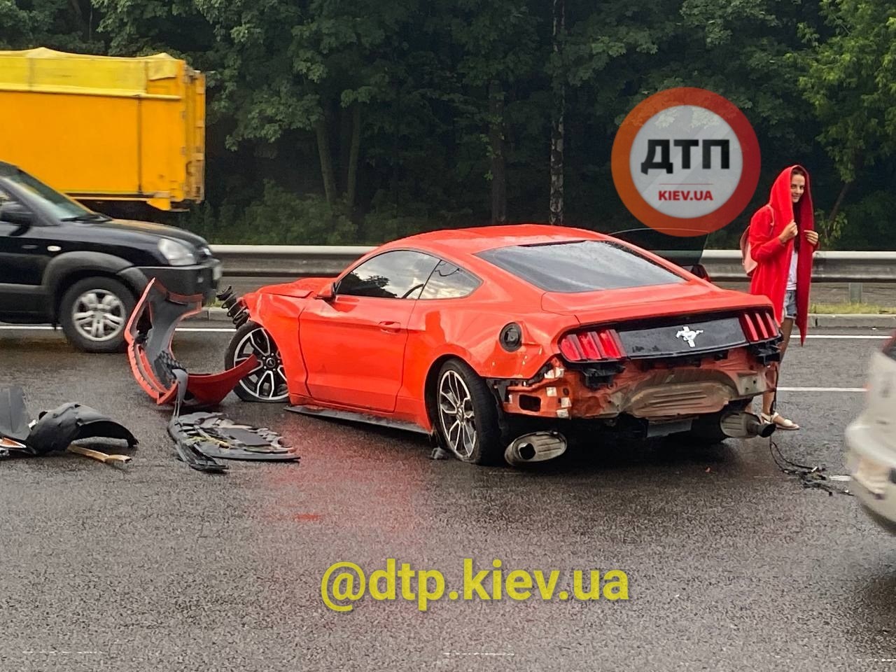 За попередньою інформацією, 30-річний хлопець взяв у оренду спорткар Ford Mustang. Коли пішов дощ, чоловік не впорався з керуванням автомобілем на мокрій дорозі, врізався в паркан і знову вилетів на дорогу. Ні він, ні пасажирка не отримали травм. Однак автомобіль відновленню, мабуть, не підлягає.