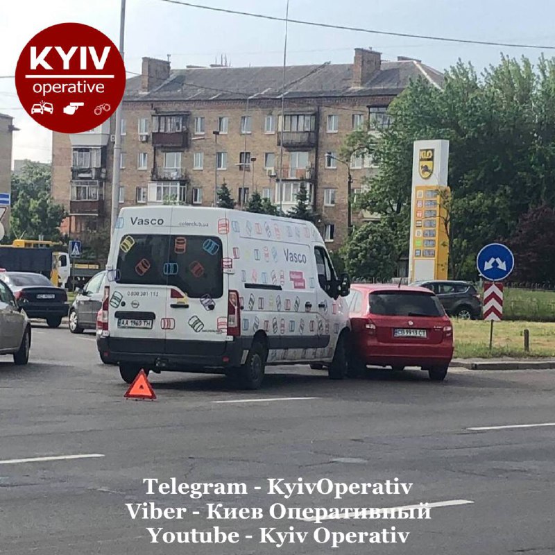 У четвер, 27 травня, в Києві на Русанівці трапилися відразу дві аварії, в ста метрах одна від одної.