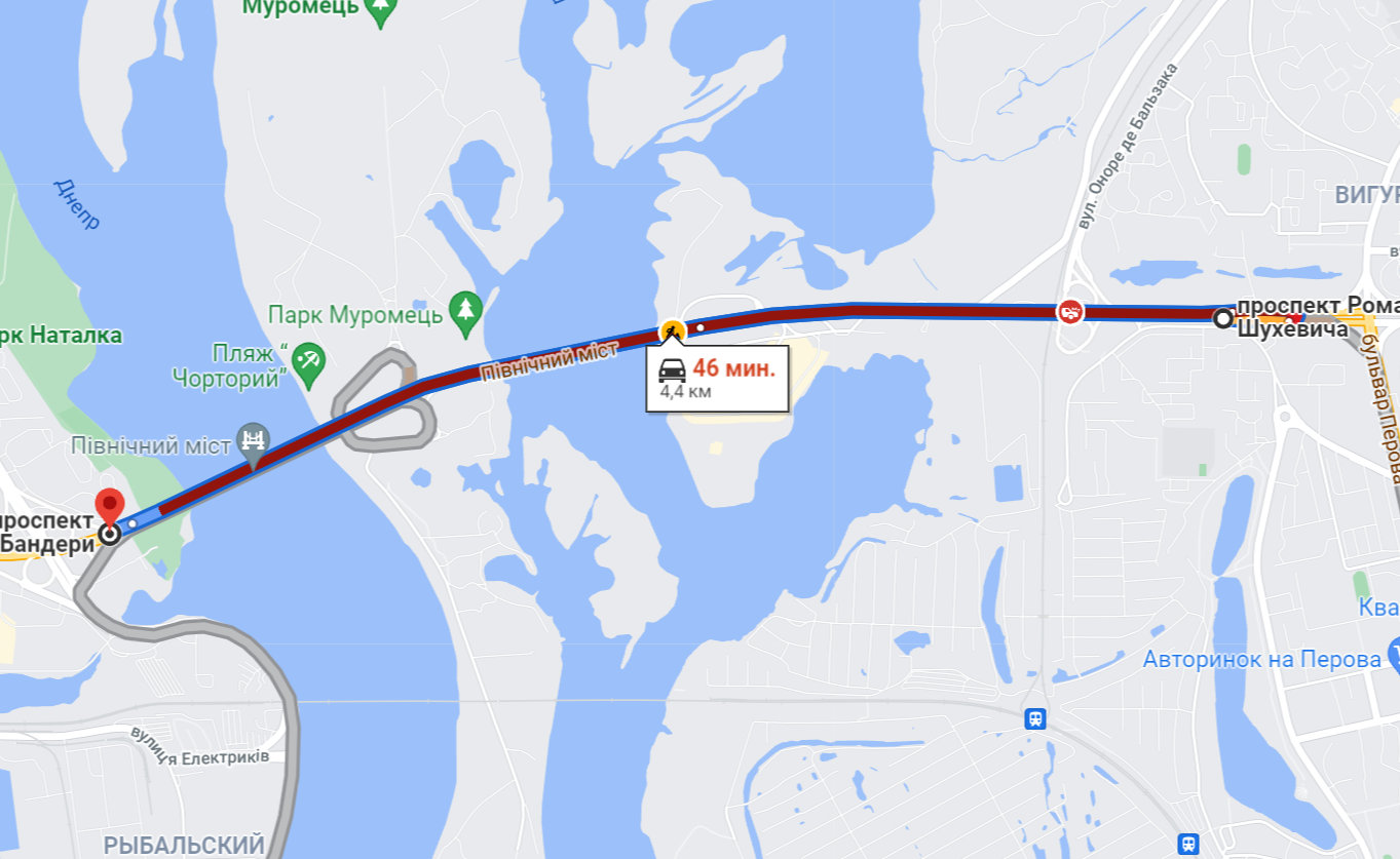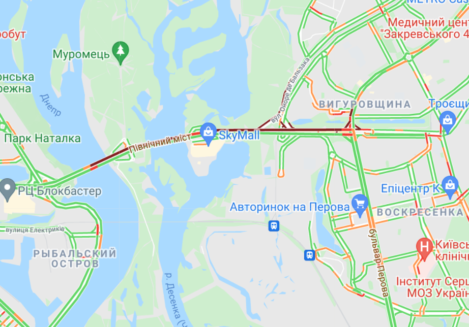Як свідчать дані Infoportal.kyiv, станом на 10:30 на Північному мосту утворилася пробка довжиною у 4 км. Зокрема, за даними Google maps, проїхати міст можна приблизно за 45 хвилин.