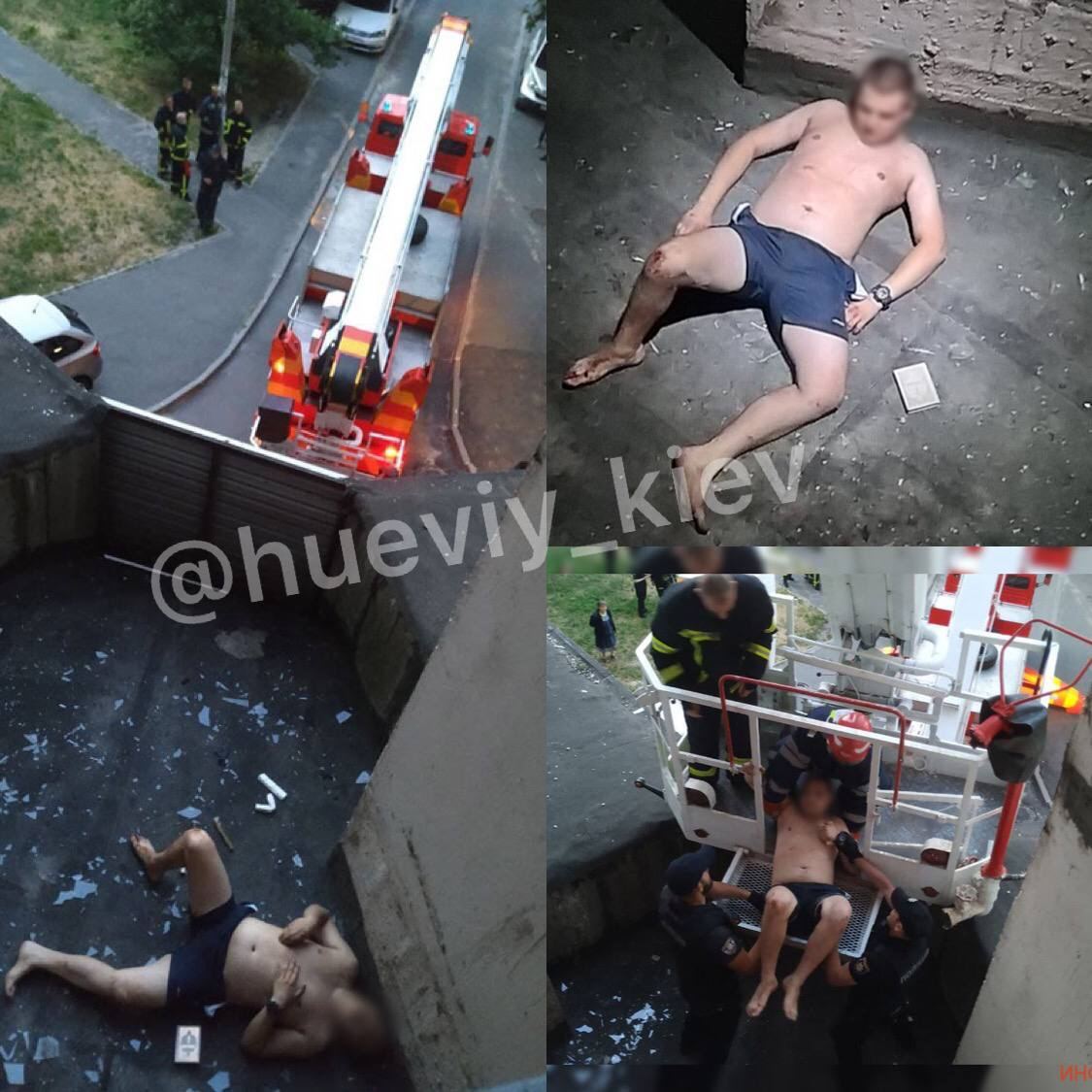 У Голосіївському районі Києва в п'ятницю, 23 липня, чоловік, що тероризував сусідів, вистрибнув з вікна п'ятого поверху. Він застряг на козирку, звідки його довелося знімати вже рятувальникам.