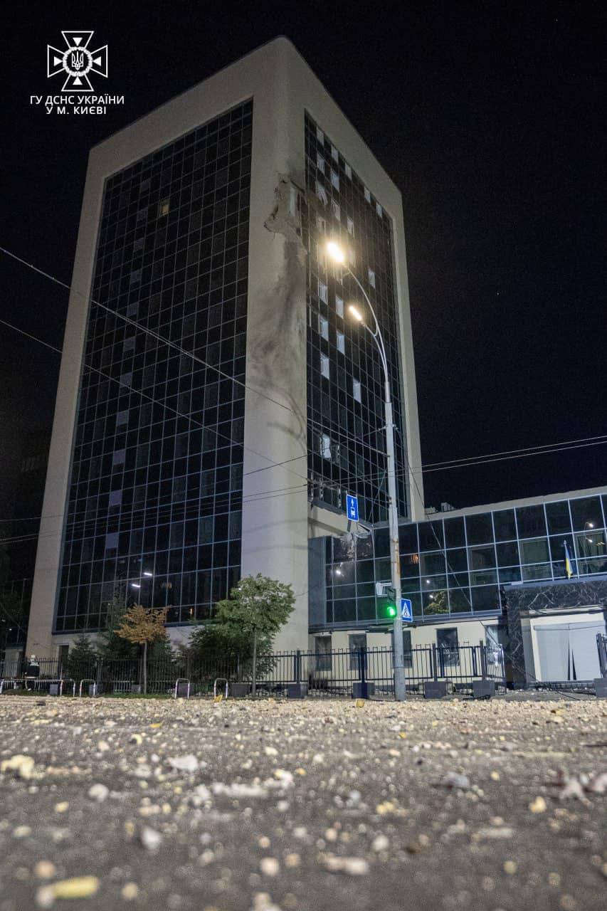 Внаслідок чергової нічної атаки іранськими дронами-камікадзе Києва у Солом"янському районі столиці пошкоджений фасад адмінбудівлі. На Київщині - загорівся приватний будинок в одній із громад області.