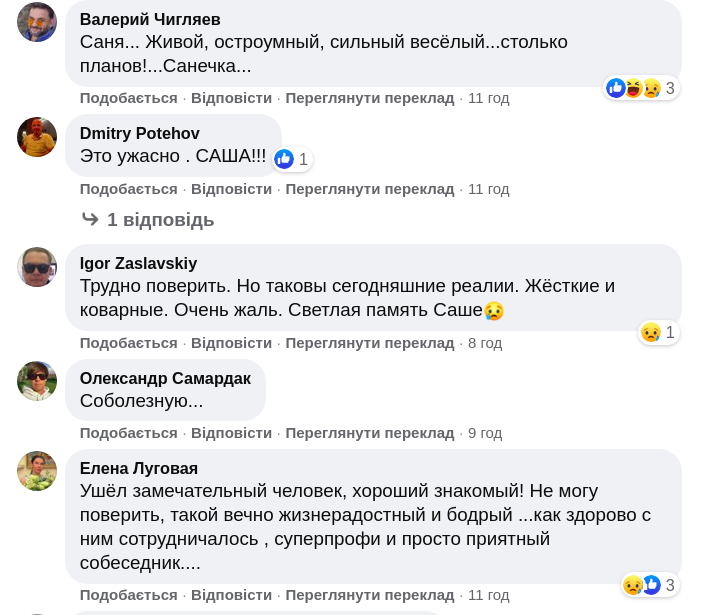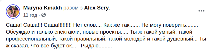 "Covid... Боже... Саня... у мене шок.. як так... Спи спокійно Друг... слів нема...", - написала продюсерка Олена Мозгова.