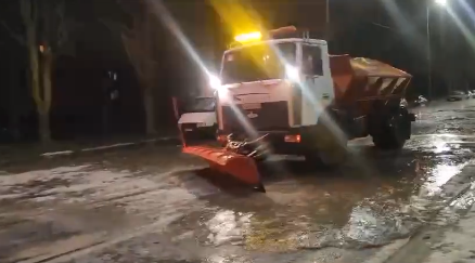 Враховуючи аварійну ситуацію та складні погодні умови дорожники здійснюють додаткову обробку вулиці, щоб забезпечити безпечний рух транспорту.