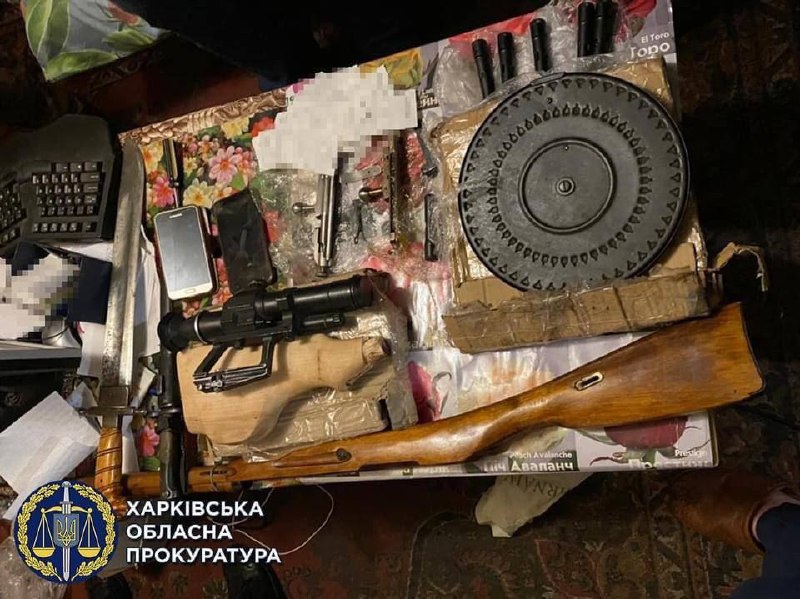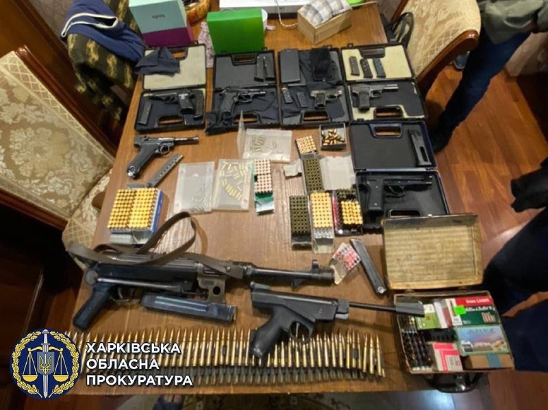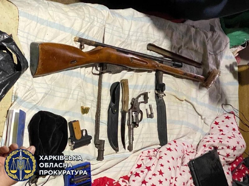 У квартирі киянина в ході обшуків були виявлені чотири бойові пістолети, 334 бойових патрона, полімерну ємність з речовиною, схожою на порох, ніж-шаблю, багнет-ніж, два дерев'яних ложе від гвинтівки Мосіна, два затвора, складові частини з кулеметами ДП-27, магазин-диск від кулемета, пістолет, револьвер, ствол гвинтівки, п'ять патронів 7,65 калібру.
