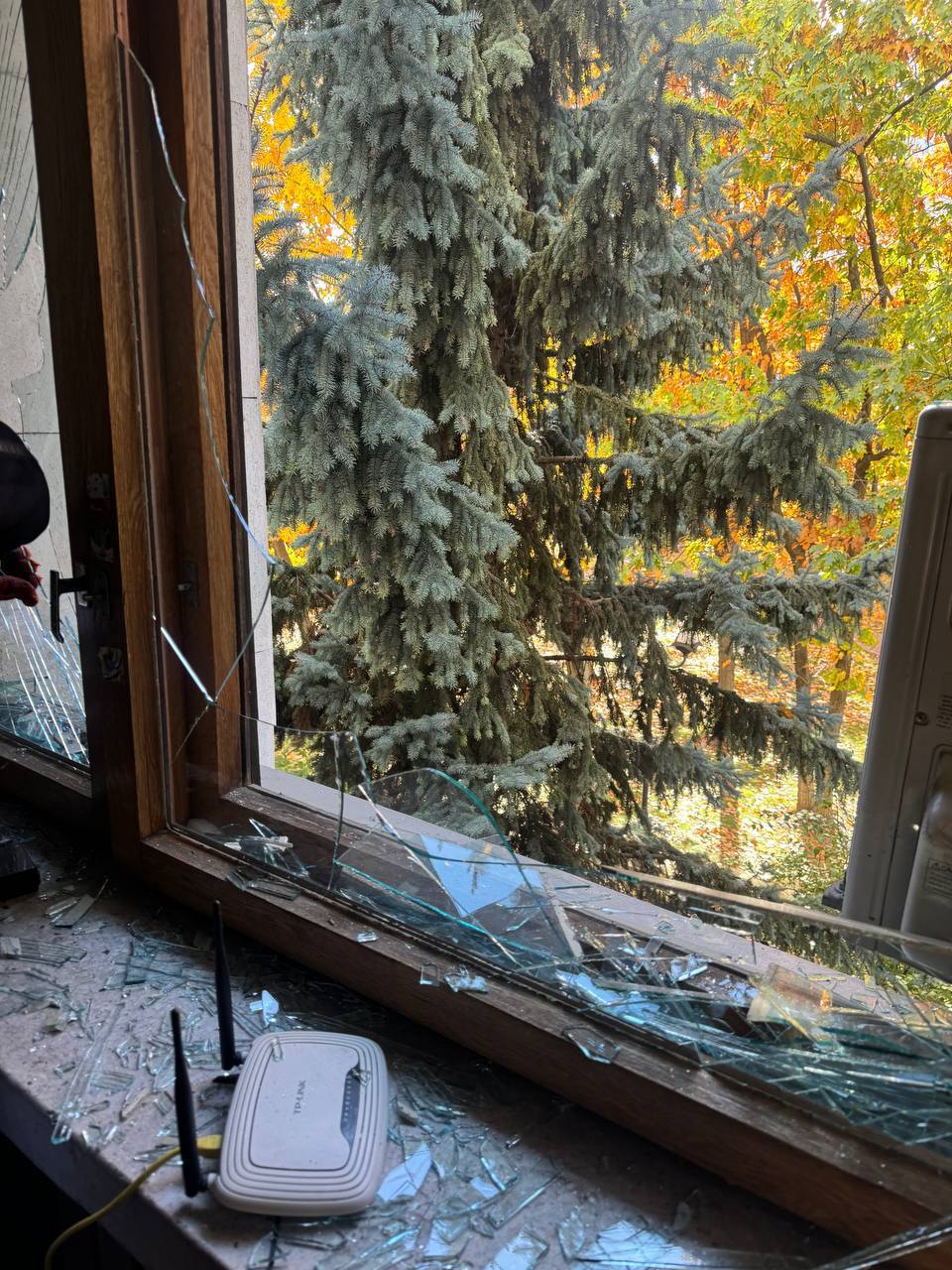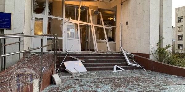 Найбільших пошкоджень зазнала фронтальна частина будівлі, що розташована ближче до гуртожитку Інститут міжнародних відносин.