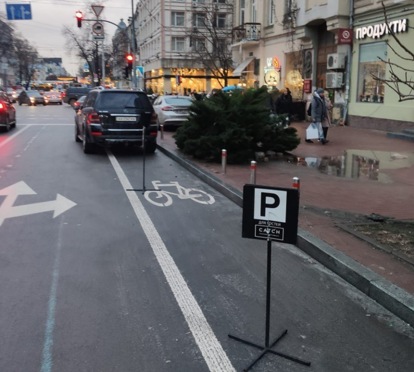 Ресторан Catch за адресою Володимирська, 12, встановив на велосмузі табличку про паркувальні місця для свого закладу. Зокрема, судячи з фото, деякі водії дійсно паркуються таким чином, перекриваючи шлях велосипедистам.