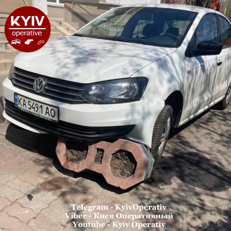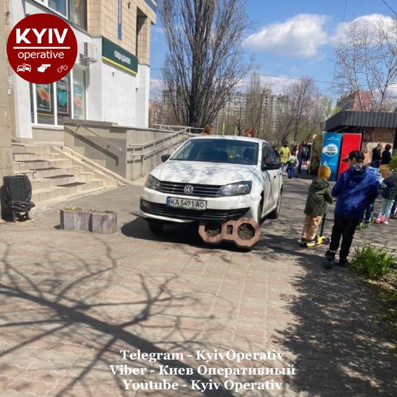 У Києві на Троєщині жінка припаркувала свій автомобіль таким чином, що знесла клумбу.
