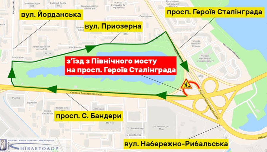 З"їзд з Північного мосту на проспект Героїв Сталінграда перекритий. Водії можуть об'їхати огородження: Північний міст – просп. Бандери – вул. Йорданська – вул. Приозерна – просп. Героїв Сталінграда.