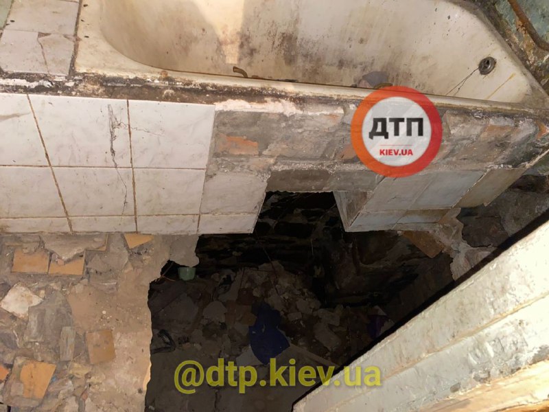 Інцидент стався на вул. Бульварно-Кудрявська 47, Печерський район. Служби швидкого реагування прибули на виклик про обвалення підлоги і одного постраждалого. Виявилася, що дірка в підлозі ванної кімнати там уже багато років. П'яний чоловік сам відсунув перегородку і впав. Він зламав ногу. Коли на місце прибули рятувальники і медики, вів себе агресивно, відмовлявся від допомоги. Його майже насильно відвезли в лікарню. Життю нічого не загрожує.