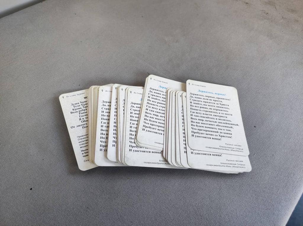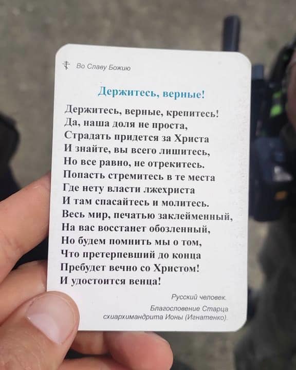 "Попівський треш або "русскій мір" головного мозку. Молитва за "спаленого живцем сиротинку-окупанта", маячня про страждання "русскава чєлавєка" - таке сміття прикордонники знайшли у попа колишньої УПЦ МП під час перевірки на в'їзді в Київ", - йдеться у повідомленні.