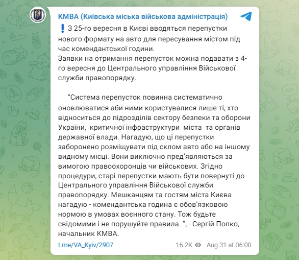 "Система перепусток повинна систематично оновлюватися аби ними користувалися лише ті, хто відноситься до підрозділів сектору безпеки та оборони України, критичної інфраструктури міста та органів державної влади. Нагадую, що ці перепустки заборонено розміщувати під склом авто або на іншому видному місці. Вони виключно пред"являються на вимогу правоохоронців чи військових", - зазначив начальник КМВА Сергій Попко.