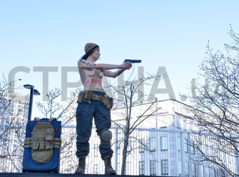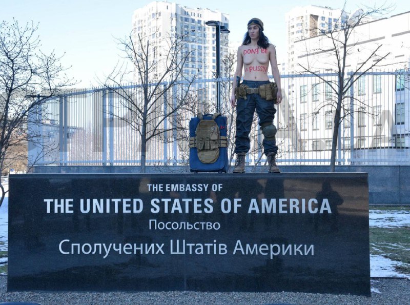 Дівчина з'явилася біля американського посольства з оголеними грудьми, у штанах у стилі мілітарі та черевиках, а також – з військовим рюкзаком. У руках вона тримала пістолет, а на грудях червоними літерами було написано: "Don't be а pussy!". Ці ж слова дівчина і вигукувала під час своєї недовгої акції протесту.