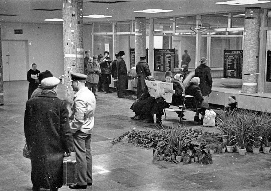 На фото можна також помітити, як тодішні мешканці столиці очікують на прибуття потрібного автобуса, деякі – лише прибули та вирушають з вокзалу додому, подеколи пішки. Зал для очікування, два поверхи з панорамними вікнами та мозаїчне декорування тоді панувало на центральному автовокзалі Києва.