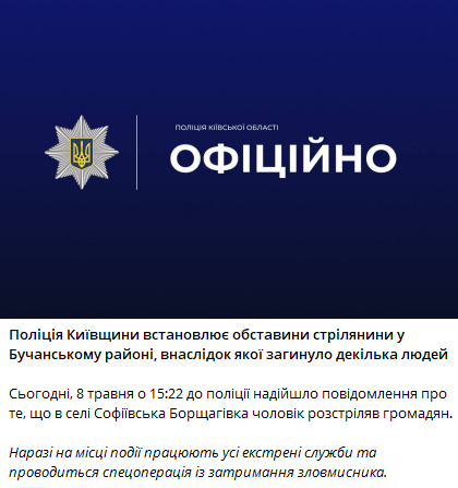 У четвер, 8 травня, у Софіївській Борщагівці Київської області невідомий чоловік розстріляв людей.