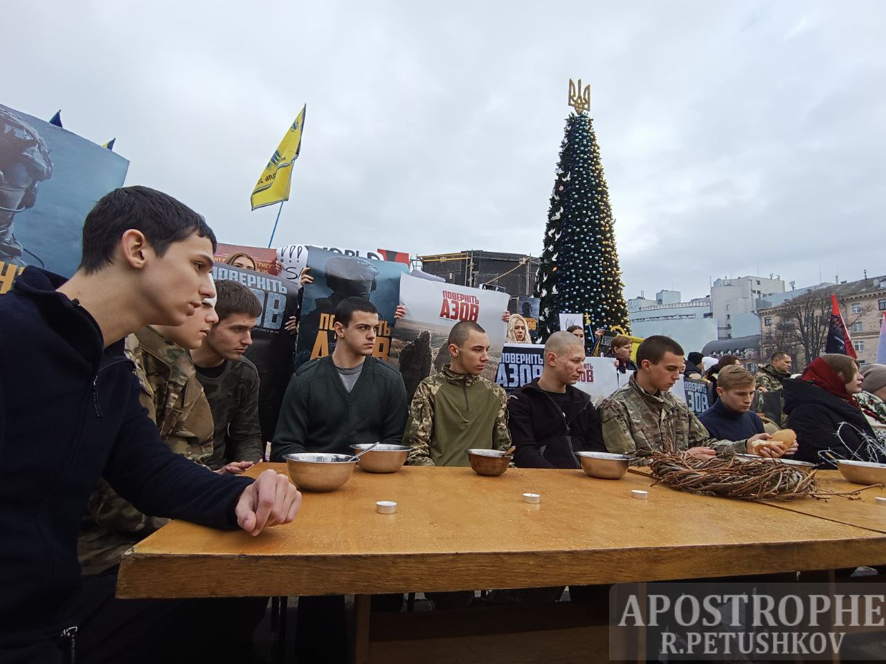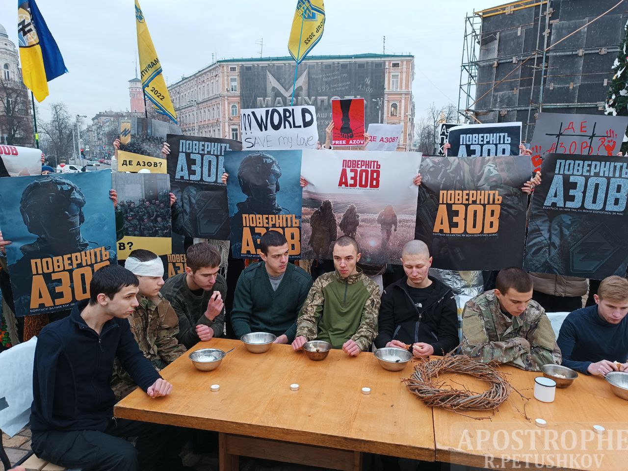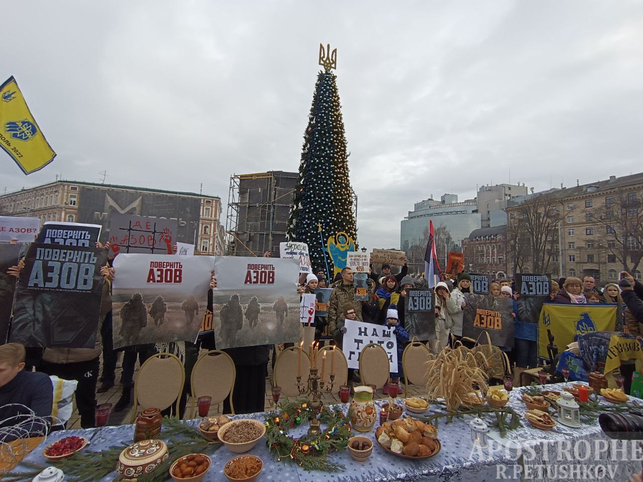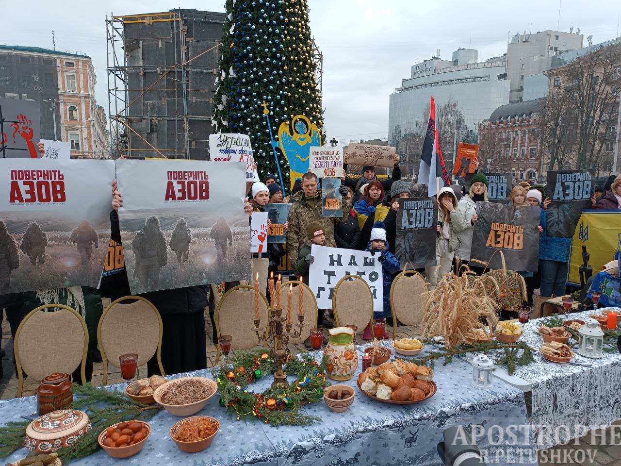У суботу, 24 грудня, родини полонених бійців з полку "Азов" провели у Києві акцію, влаштувавши перформанс "Полк АЗОВ: Різдво в полоні". Вони просять помолитися за "азовців" всіх українців, які святкуватимуть Різдво на цих вихідних.