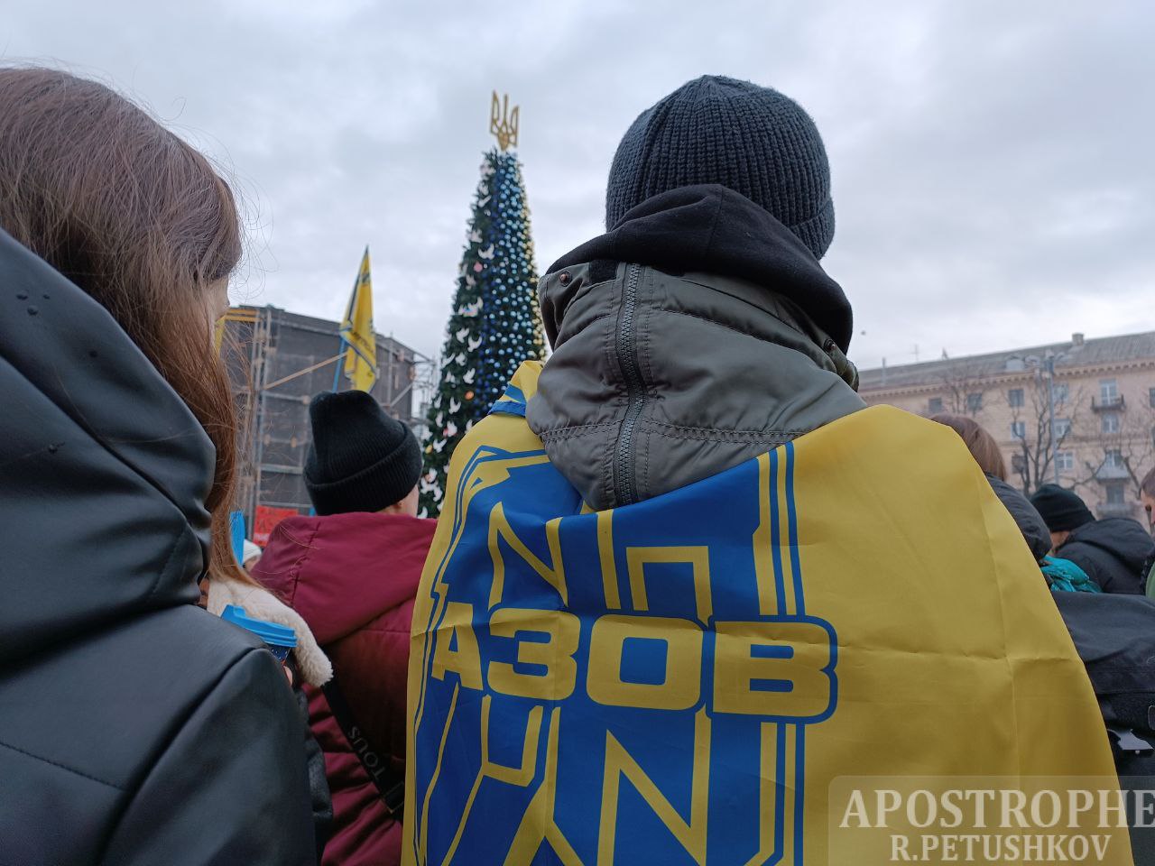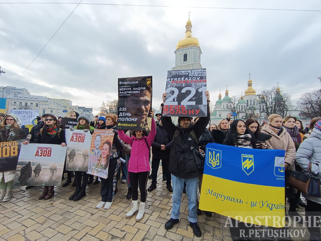 Мирна акція триває з 14:00 на Софіївській площі. На даний момент зібралося близько 200 людей, щоб підтримати родини українських захисників з "Азову", які боронили Маріуполь від російських загарбників.
