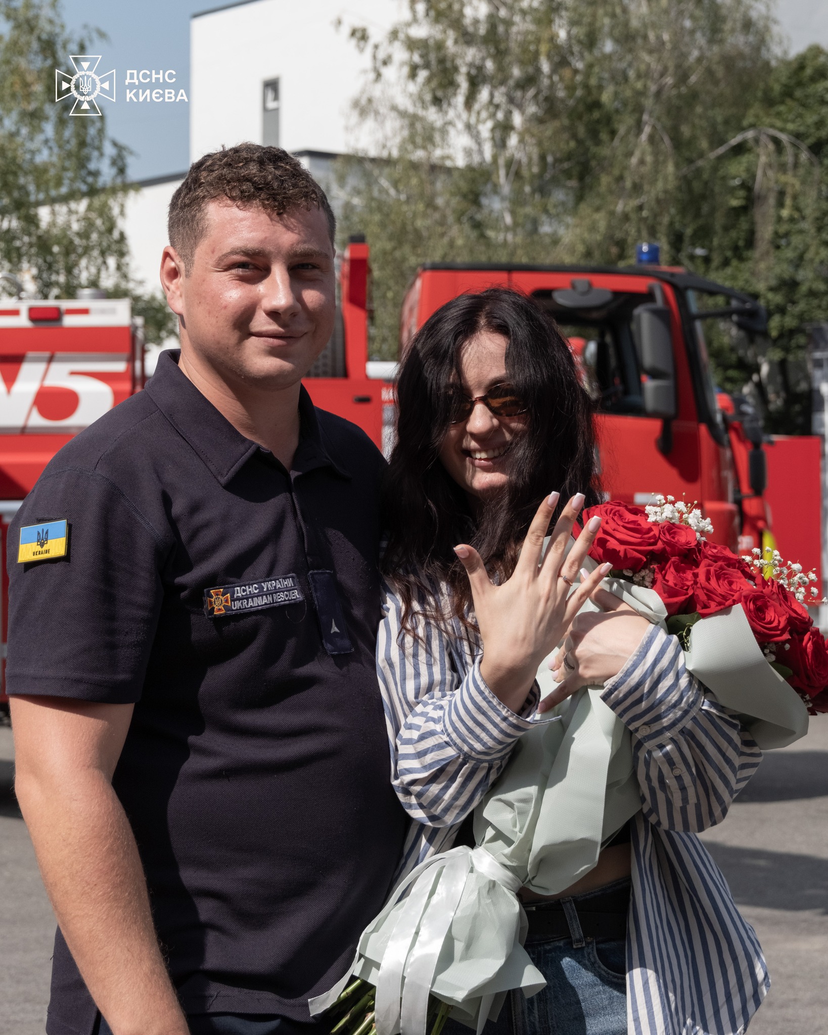 Рятувальник Дмитро Фатальчук зробив пропозицію, на яку отримав заповітне "Так!". Після цього пара разом спустилася "з висоти 5 поверху, щоб розділити радісну мить разом зі своїми колегами".