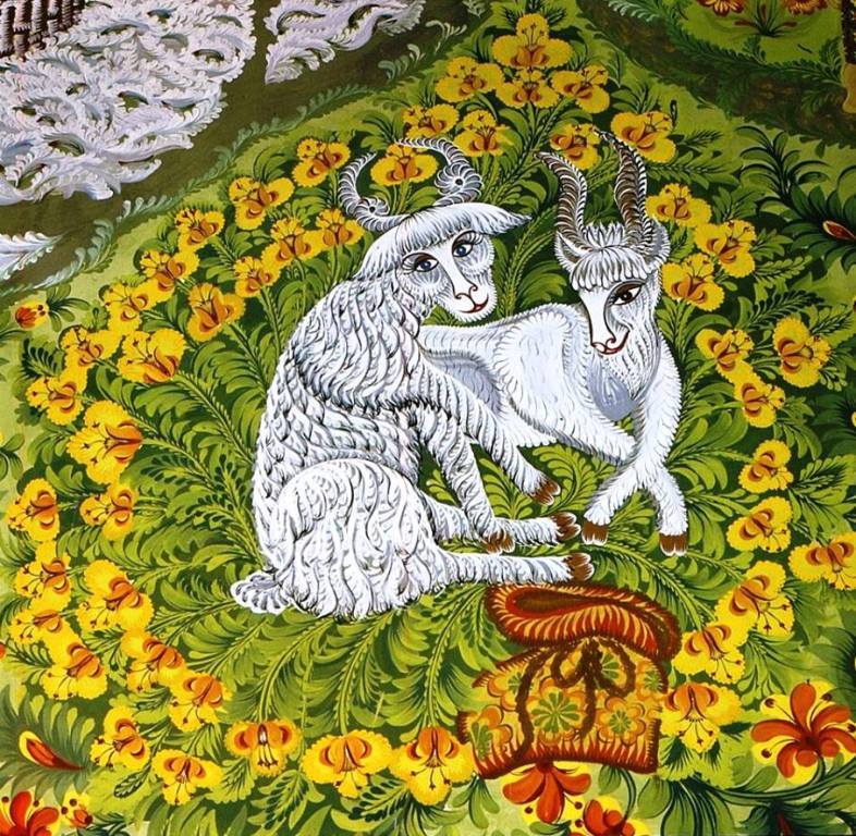 Сюжетні розписи на стінах магазину переходили одне в одне і перепліталися. Тому важко назвати точну кількість окремих панно, але прийнято вважати, що їх було близько 35. Особливої уваги заслуговувала велика піч та інші поверхні з класичним петриківським розписом.
