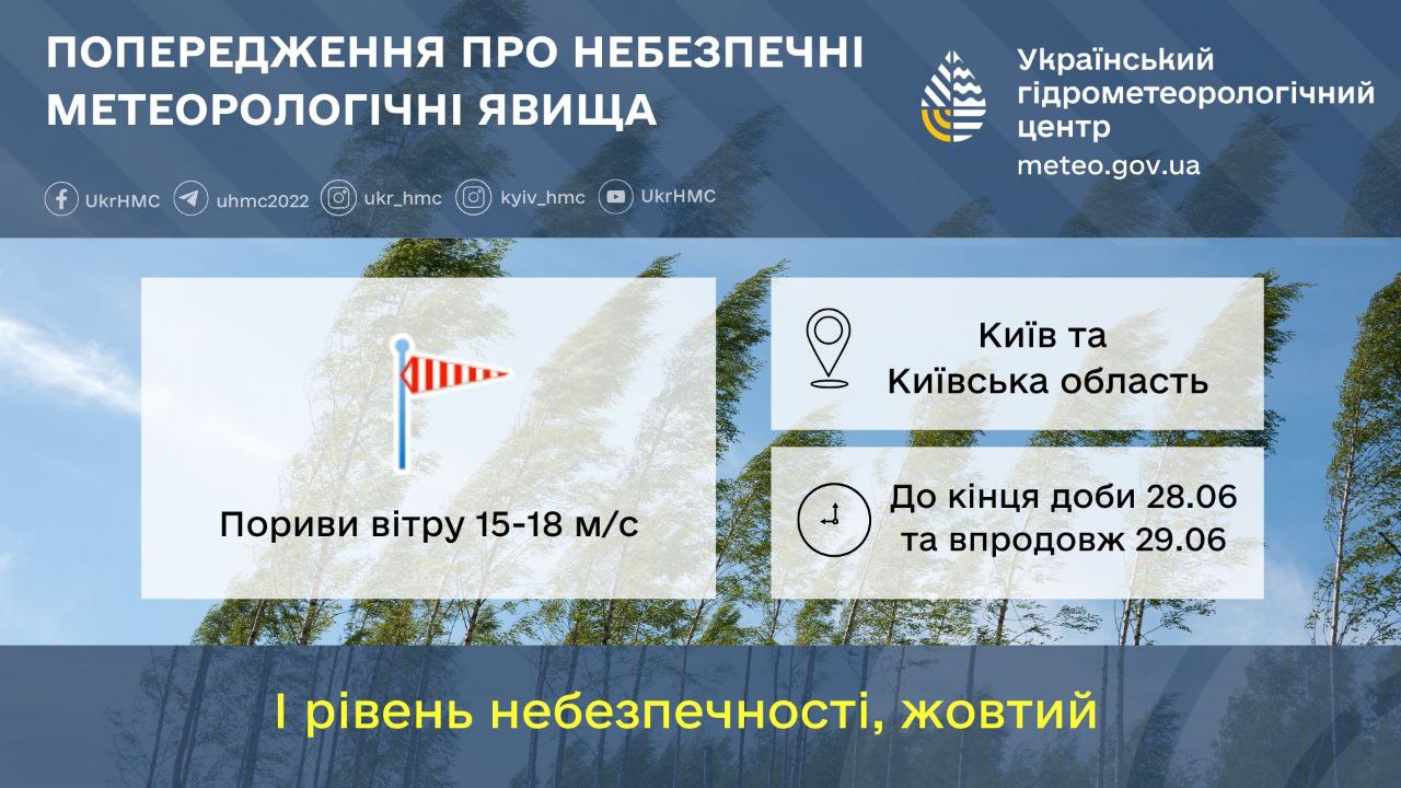 "Попередження про небезпечні метеорологічні явища по території Київщини та м. Києву. … з утриманням до кінця доби 28 червня та впродовж доби 29 червня (очікуються - ред.) пориви вітру 15-18 м/с. I рівень небезпечності, жовтий", - йдеться в повідомленні.