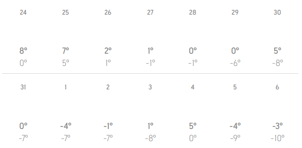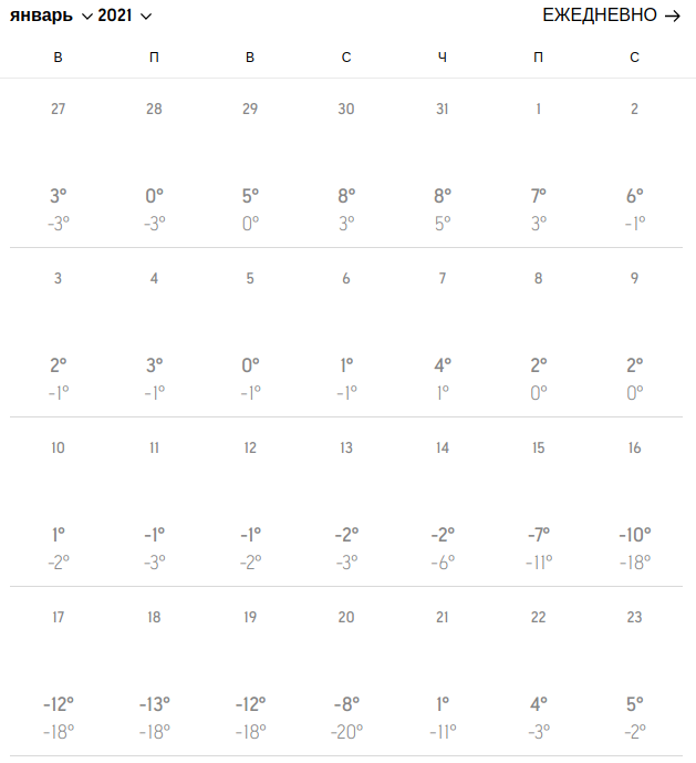 У січні, як і личить, стане прохолодніше. Вночі температура опускатиметься аж до 20-градусного морозу. Найнижчі температури очікуються у період з 16 по 20 січня.