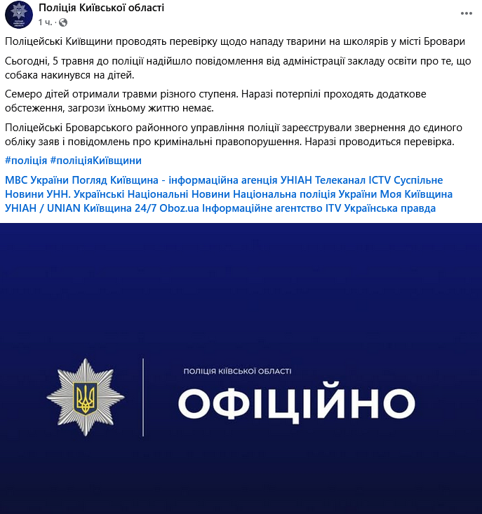 Броварське райуправління поліції зареєструвало звернення до єдиного обліку заяв і повідомлення про кримінальні правопорушення. Поліцейські почали здійснювати перевірку щодо нападу тварини на школярів.