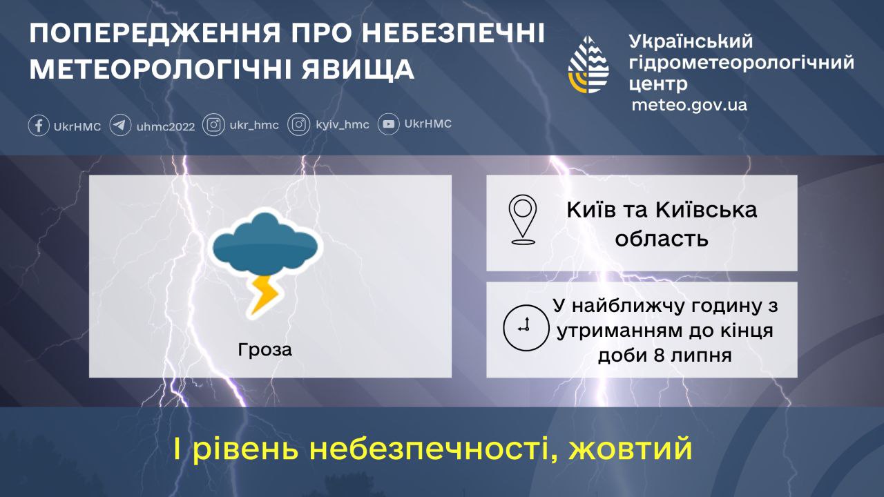 Згідно з попередженням, у найближчу годину з утриманням до кінця дня 8 липня очікується гроза. Зазначено, що прогноз відповідає I рівню небезпечності – жовтому.