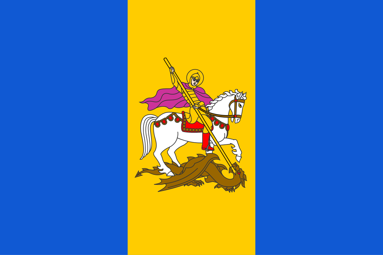 Прапор зараз складається з трьох вертикально розташованих смуг: синіх з боків, жовтої - в центрі. На центральній смузі зображено постать святого Юрія (Георгія) та змія. Автор - той же.