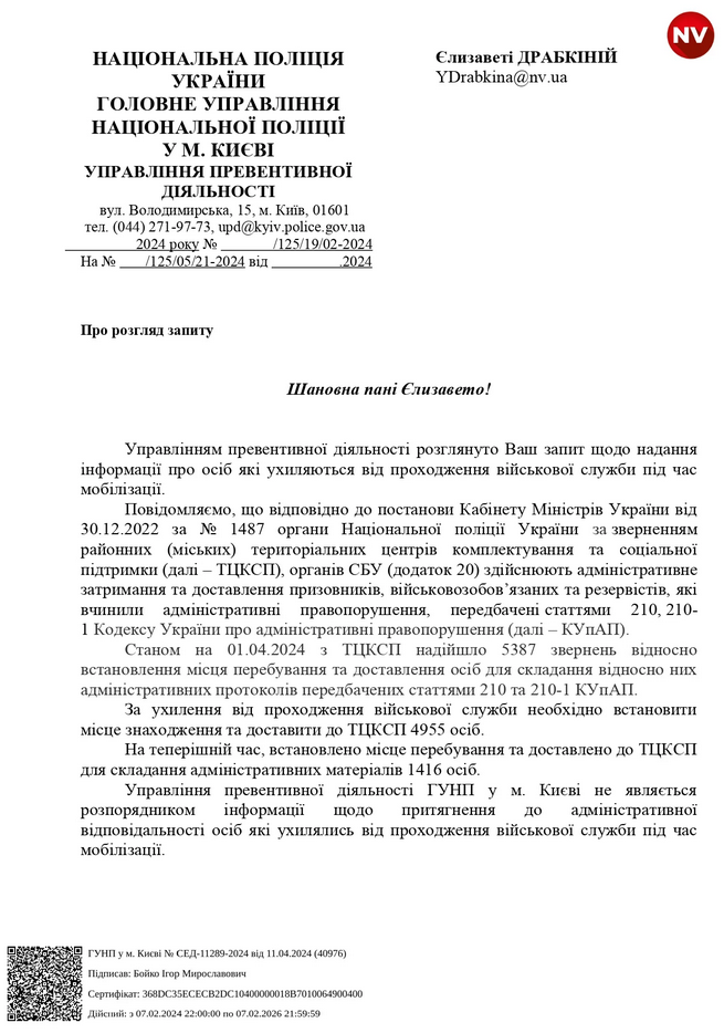 Такі дані навели в Управлінні превентивної діяльності ГУ Національної поліції в Києві у відповіді на інформаційний запит видання NV.
