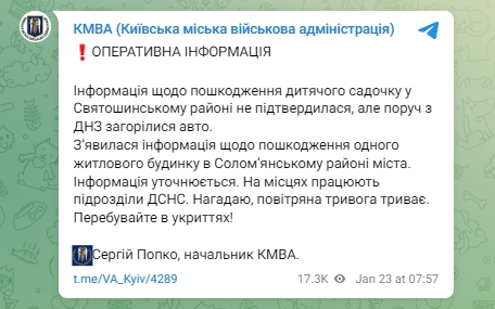 "Інформація щодо пошкодження дитячого садочку у Святошинському районі не підтвердилася, але поруч з ДНЗ загорілися авто. З"явилася інформація щодо пошкодження одного житлового будинку в Солом"янському районі міста. Інформація уточнюється. На місцях працюють підрозділи ДСНС", - йдеться у повідомленні.