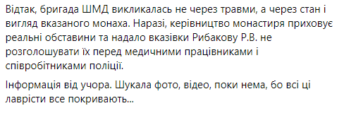 Відтак, бригада ШМД викликалась не через травми, а через стан і вигляд вказаного монаха, зазначає журналістка. Керівництво ж монастиря приховує реальні обставини та надало вказівки постраждалому не розголошувати їх перед медичними працівниками та співробітниками поліції.
