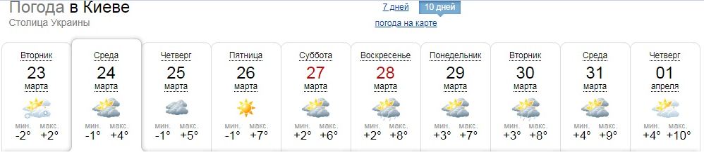 За прогнозом сервісу, 26 і 27 березня вже з ранку температура повітря буде плюсовою, а вдень позначка термометра підніметься від шести до восьми градусів тепла відповідно. Однак у неділю, 28 березня, прогнозують опади у вигляді дощу.