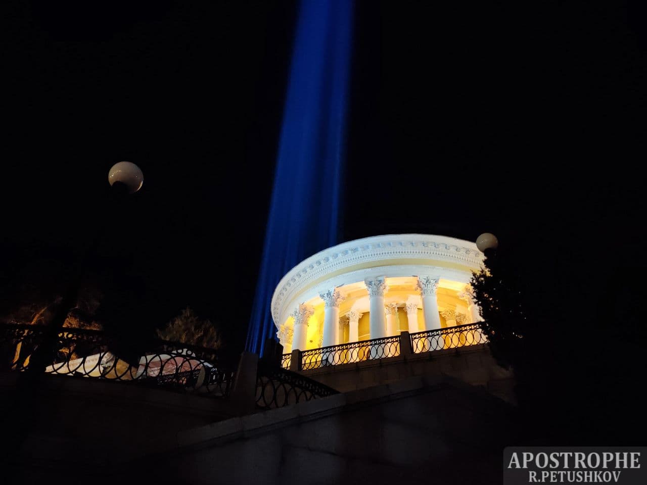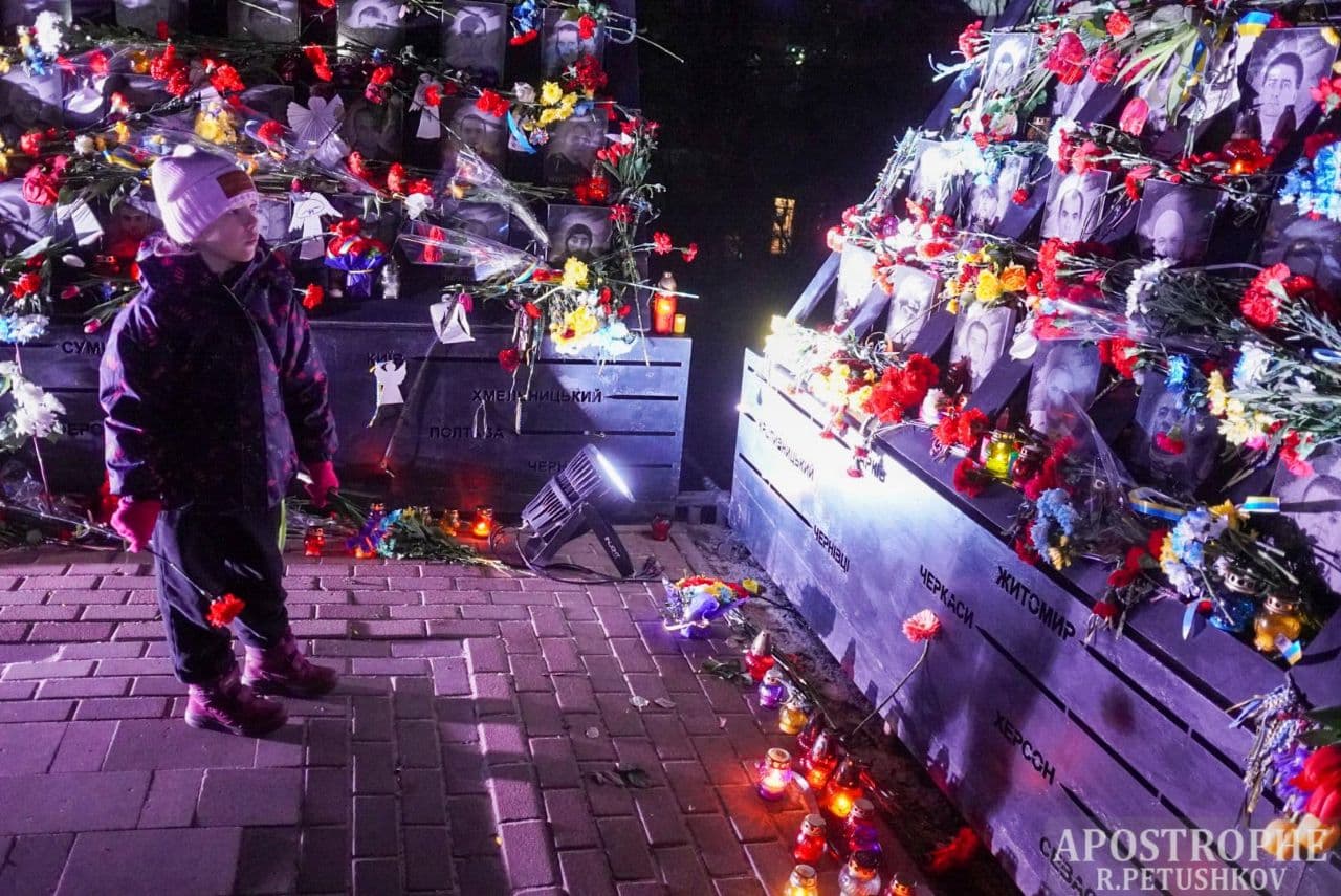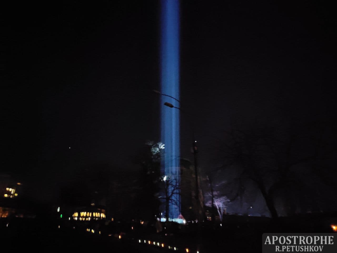 Потім на алеї Героїв Небесної Сотні відбулося вмикання світлової інсталяції "Промені гідності" з аудіосупроводом музики Романа Коляди.