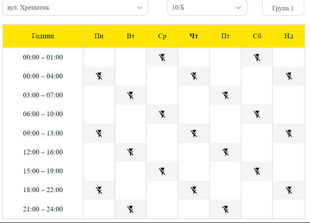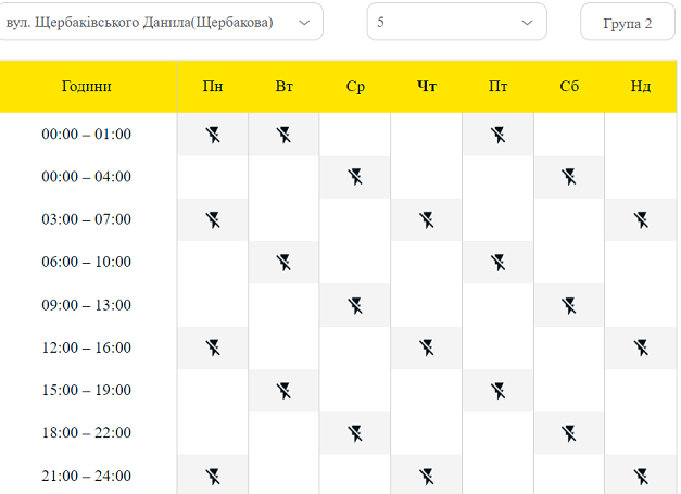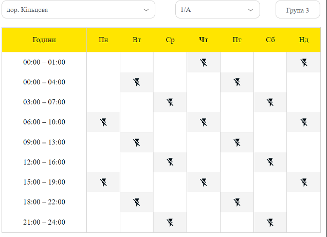 За розкладом на сайті Yasno, світло мають вимикати в середньому на 8-12 годин. Кожного дня по два-три відключення по 3-4 години. Інтервали можуть бути зрушені на близько 40 хвилин.