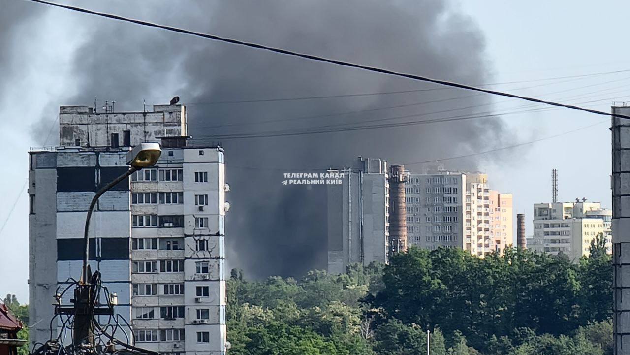 У мережі публікують кадри з густим чорним димом над будівлями з боку Голосіївського району.