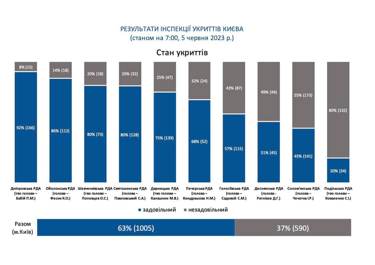 У Києві станом на ранок понеділка, 5 червня, перевірили 1664 укриття. Близько третини сховищ столиці перебувають у незадовільному стані, найгірша ситуація - у Подільському районі.