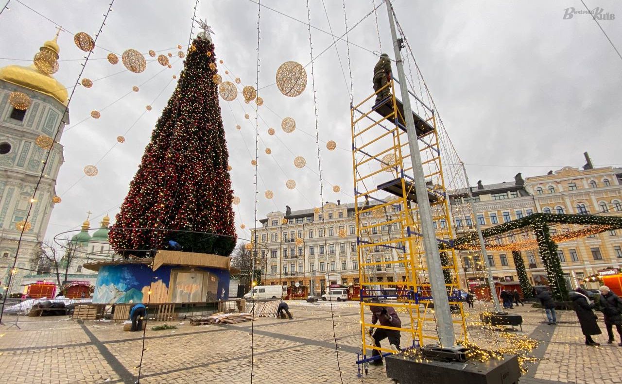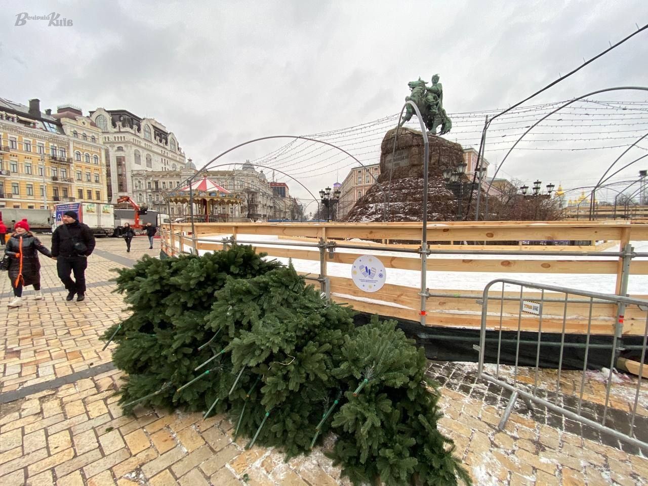 У понеділок, 17 січня, комунальники почали демонтувати головну ялинку країни, що на Софійській площі, ярмаркові будиночки, ковзанку та каруселі.
