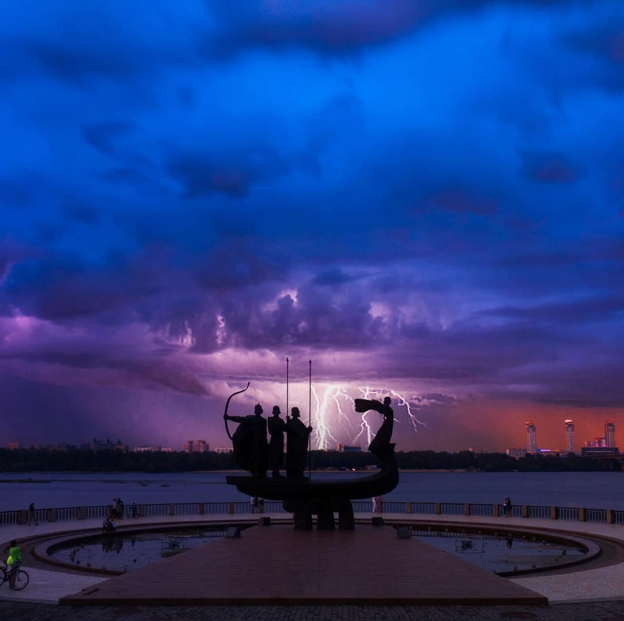 Один з таких знімків був зроблений на набережній Дніпра, в Наводницькому парку. На кадрі пам'ятник легендарним засновникам Києва відображений на тлі потужного розряду блискавки, котра забарвила небо в рожеві, фіолетові та сині відтінки.