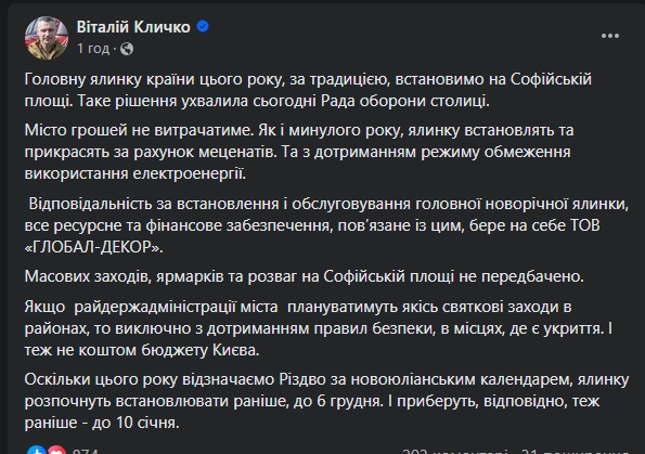 "Головну ялинку країни цього року за традицією встановимо на Софійській площі. Таке рішення прийняла сьогодні Рада оборони столиці. Місто грошей не витрачатиме. Як і минулого року, ялинку встановлять та прикрасять коштом меценатів. І з дотриманням режиму обмеження використання електроенергії" , - написав Кличко.