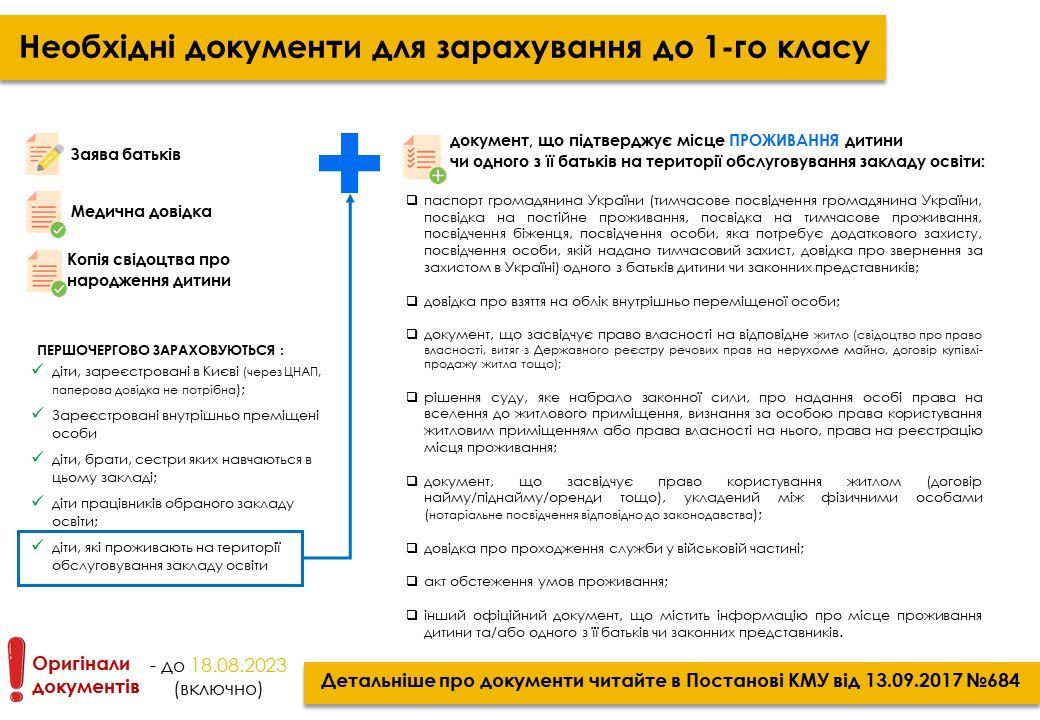 Необхідними документами для зарахування до першого класу є заява батьків, медична книжка, копія свідоцтва про народження дитини, а також, за наявності, документ, що підтверджує місце проживання дитини чи одного з її батьків на території обслуговування закладу освіти.
