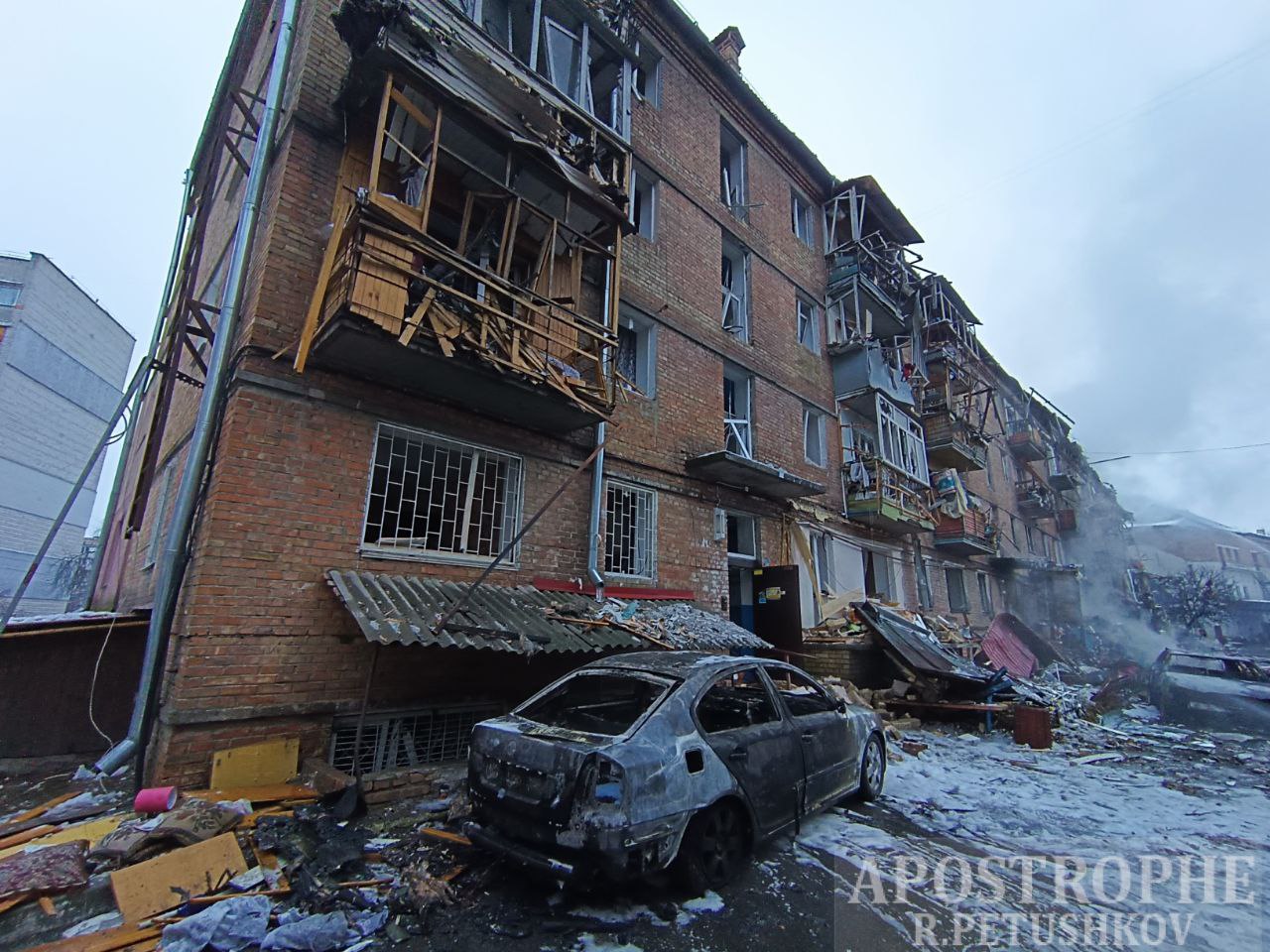 Сусідні будинки навкруги теж сильно побито у результаті атаки.