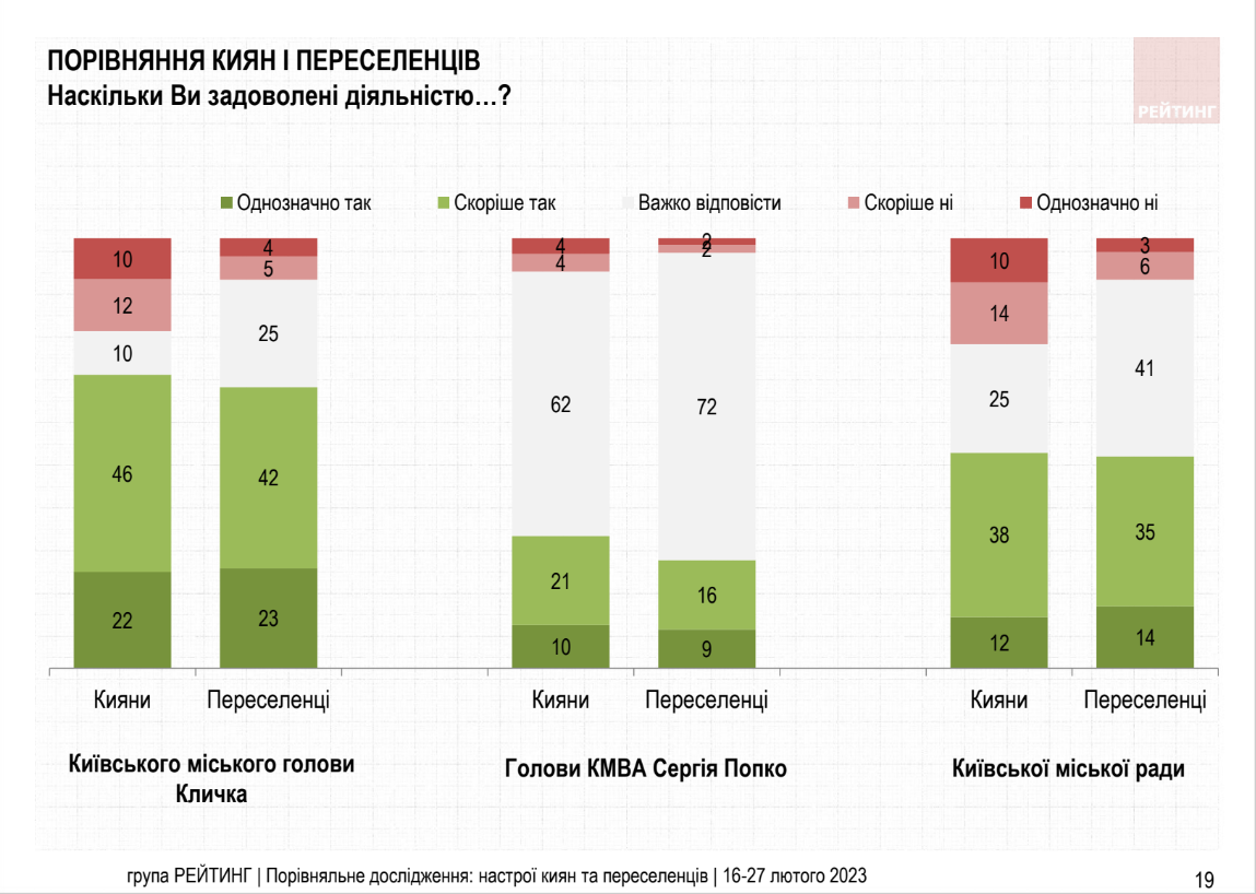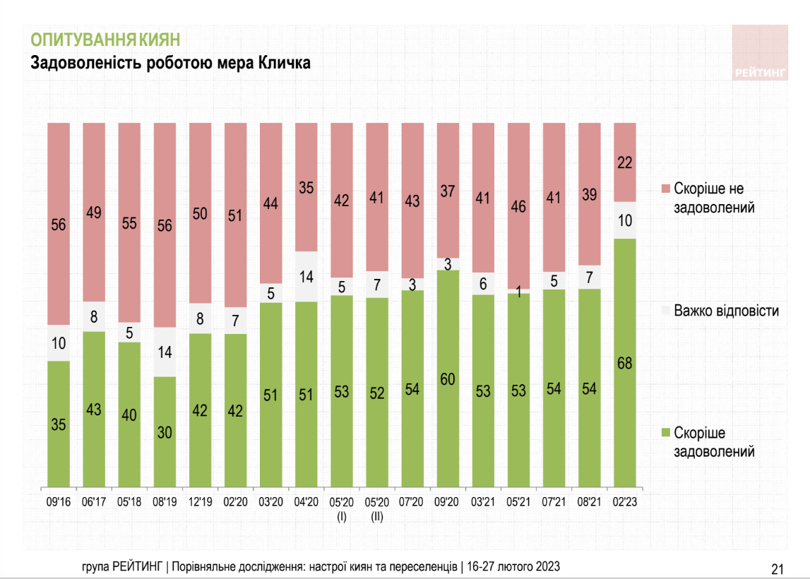 "За останній рік оцінки діяльності місцевої влади, соціальних та комунальних служб серед киян значно покращилися. Зокрема діяльністю міського голови Києва Віталія Кличка задоволені 68%. Комунальними службами Києва задоволені майже 70% місцевих мешканців. Діяльністю громадського транспорту задоволені більше 80% киян", - йдеться у повідомленні групи "Рейтинг".