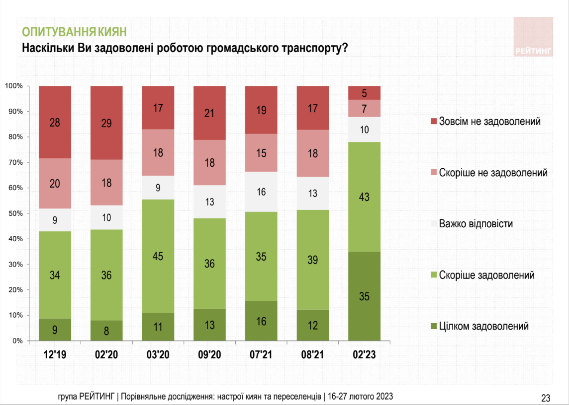 Це найвища оцінка діяльності міської влади за останні 5 років. Приміром, у 2019 році роботу комунальних служб схвально оцінювали лише 23% киян (зараз – 69%), роботу громадського транспорту – 43% (сьогодні – 78%).
