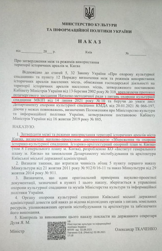 В Мережі з'явилося фото наказу Міністерства культури та інформаційної політики України "Про затвердження меж та режимів використання території історичних ареалів м. Києва".