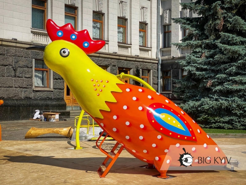 Під будівлею ОП на Банковій майже закінчили монтаж незвичайного дитячого майданчика з дивними істотами, які можна зустрітити на картинах української художниці Марії Примаченко. Наразі неясно, скільки простоїть тут майданчик, і чи присвячений він річниці незалежності України.