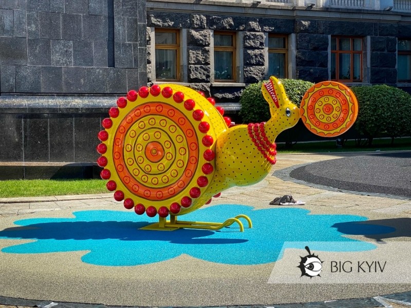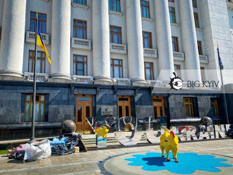 Біля будівлі Офісу президента в Києві встановили яскравий дитячий майданчик з дивними істотами.