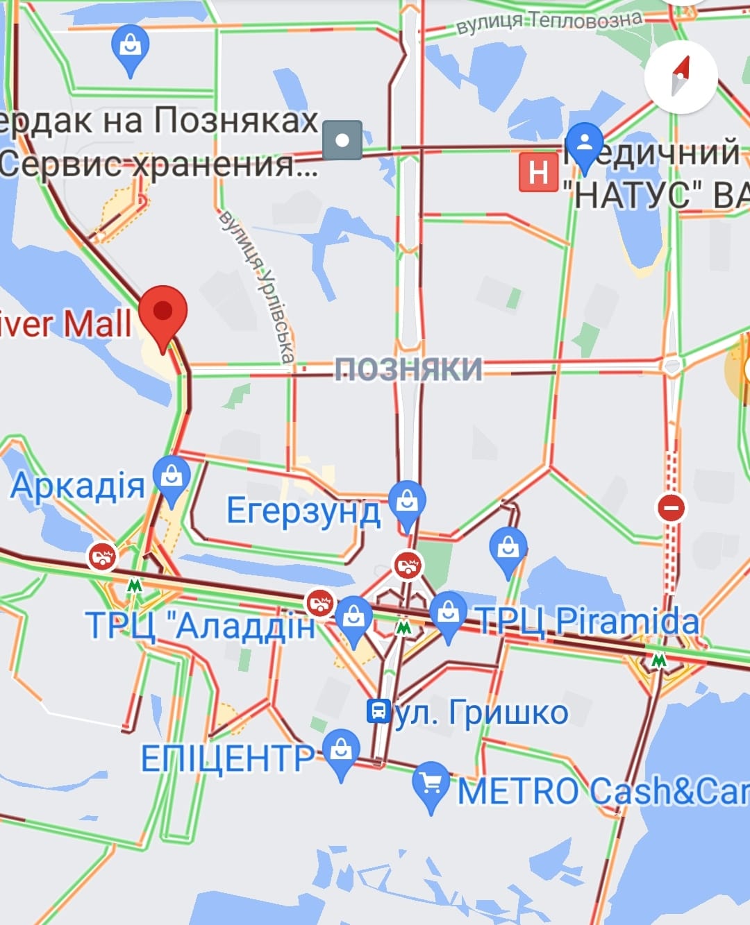 Автомобілі стоять намертво на вулиці Вишняківській та проспектах Миколи Бажана та Петра Григоренка.