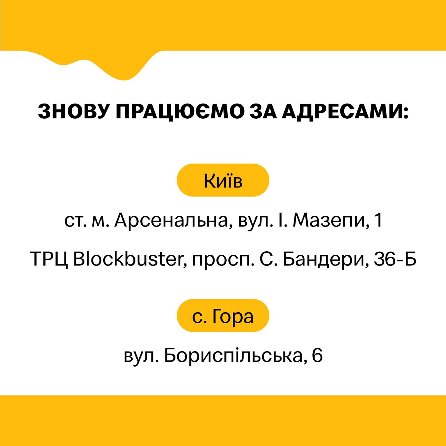 Так, з 27 жовтня відновлюють роботу ресторани за такими адресами:
