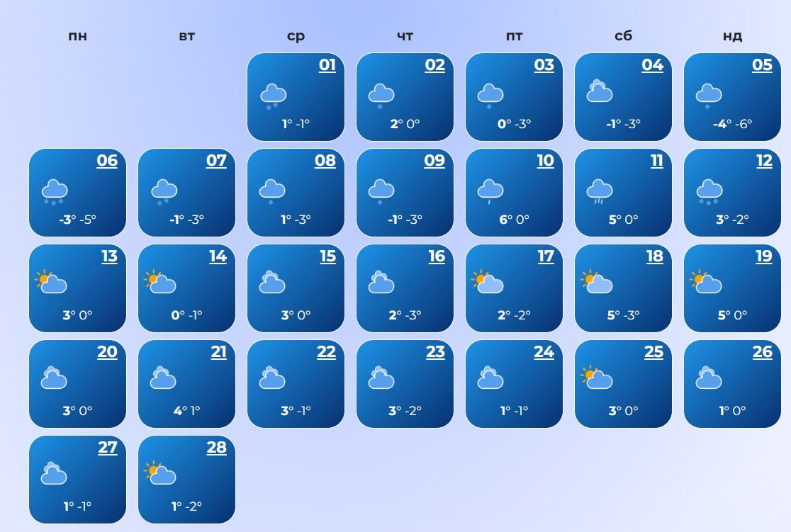 Упродовж лютого найнижча температура повітря очікується 5-6 лютого, тоді прогнозують 3-4 градусів морозу вдень, та до -6 градусів - вночі.