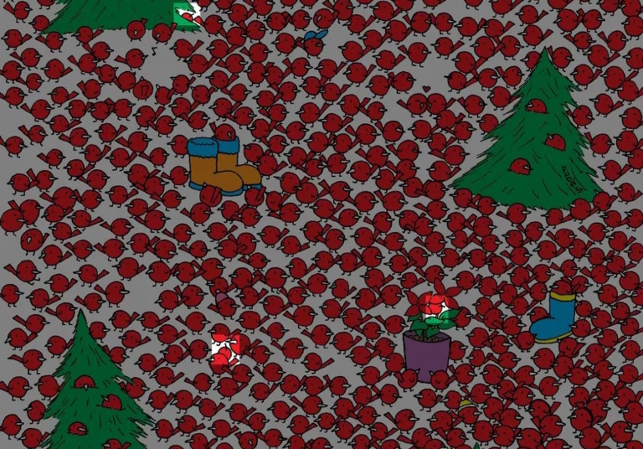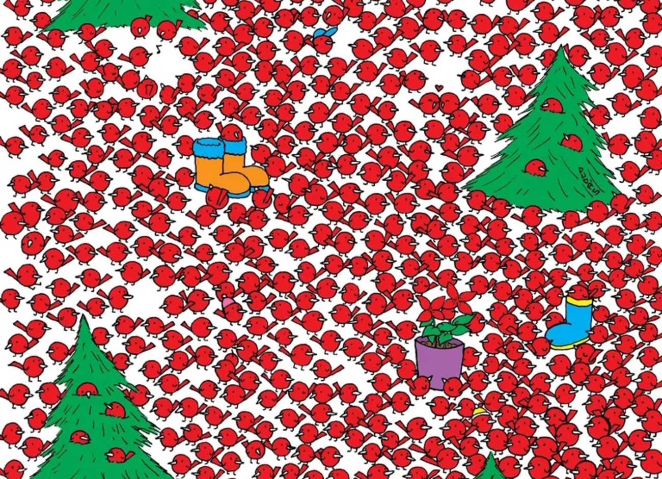 На малюнку художник зобразив безліч пташок червоного кольору. На перший погляд, їх не можна відрізнити від яблук. Для успішного вирішення завдання потрібно зосередитися на головоломці, але не брати до уваги пташок.